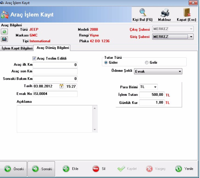 * Araç kiralama veya işlem kayıtlarında km takibi yapabilir,