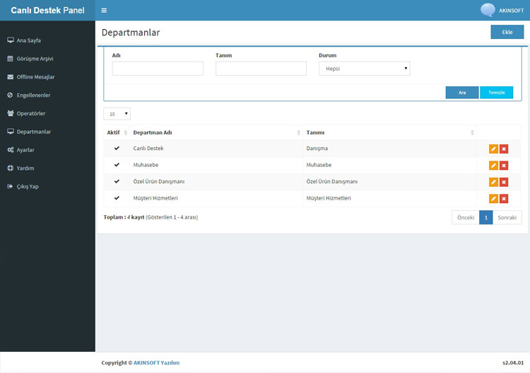 Yönetici paneli, Operatör paneli, Müşteri giriş paneli, Operatör kayıtları.